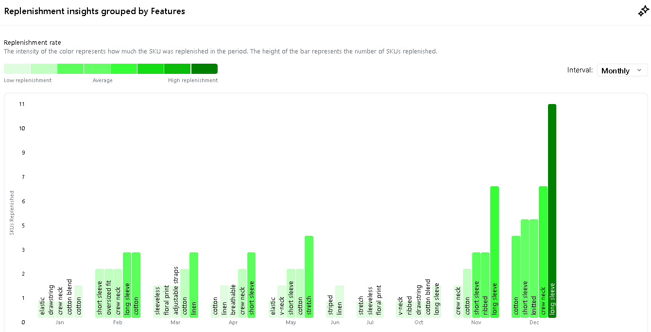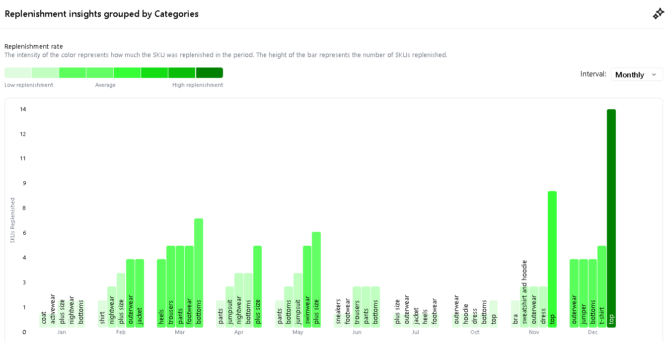 Restocks are one of the clearest indicators of what customers are consistently buying and what a brand sees strong commercial performance in. To understand where Yours Clothing is seeing the greatest demand in 2025, we analysed 67,000 products using Woveninsights’ Market Insights module, focusing specifically on replenishment activity across the year.