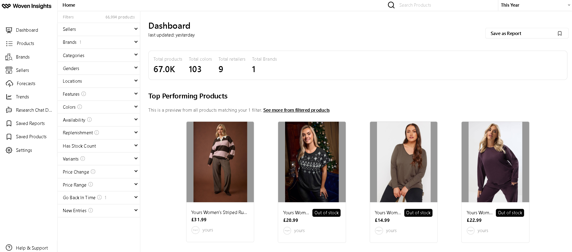Woveninsights is a comprehensive market analytics solution that provides fashion brands with real-time access to retail market and consumer insights, sourced from over 70 million real shoppers and 20 million analyzed fashion products. Our platform helps brands track market trends, assess competitor performance, and refine product strategies with precision.