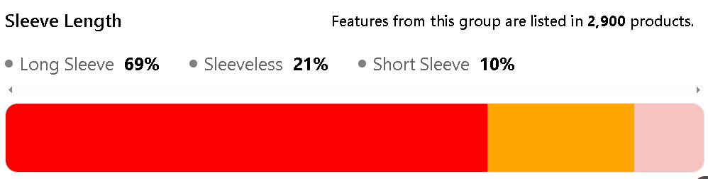 The top features within this category are Long Sleeve (69%), Sleeveless (21%), Short Sleeve (10%).