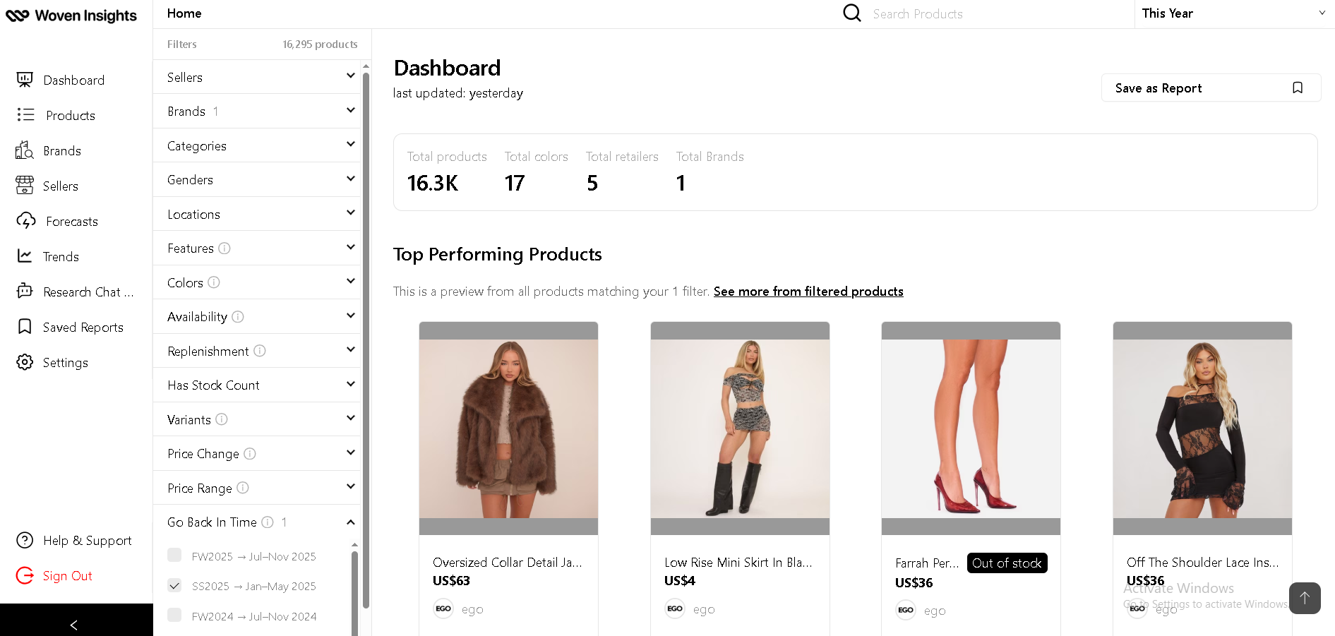 EGO’s 2025 lineup highlights the brand’s growing strength in fast-moving, trend-led fashion. Known for translating runway aesthetics into accessible, statement-driven pieces, the brand continues to expand its reach across apparel and footwear. Using Woveninsights’ Market Insights module, we analyzed more than 16,000 products released between January and May 2025 to uncover which categories dominate the assortment and the features that define them.