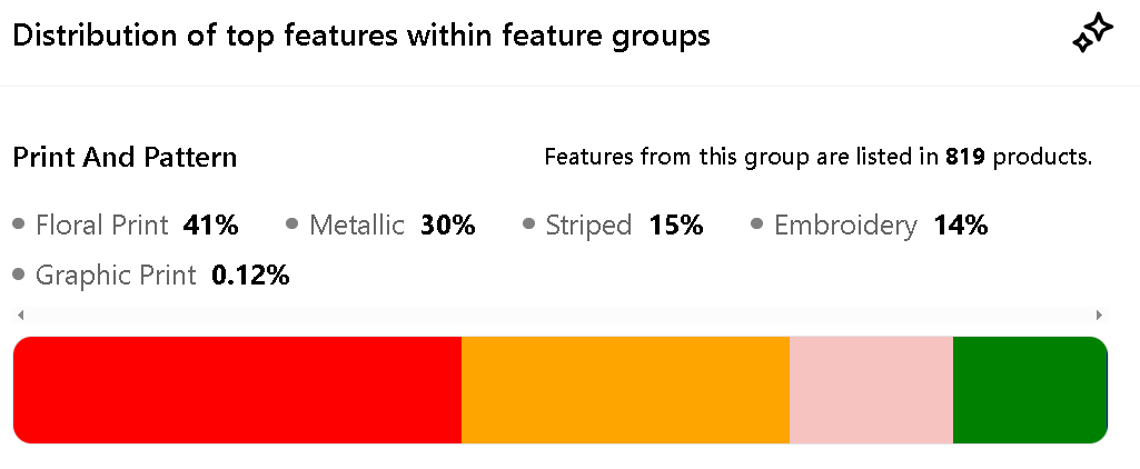 The top features within this category are Floral Print (41%), Metallic (30%), Striped (15%), Embroidery (14%).
