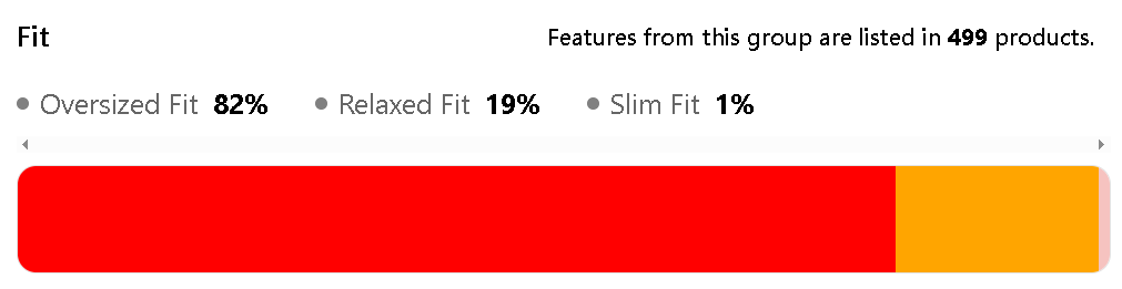 The top features within this category are Oversized Fit (82%), Relaxed Fit (19%), Slim Fit (1%).