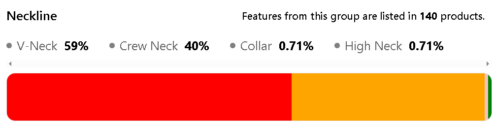 The top features within this category are V-Neck (59%), Crew Neck (40%), Collar (0.71%).