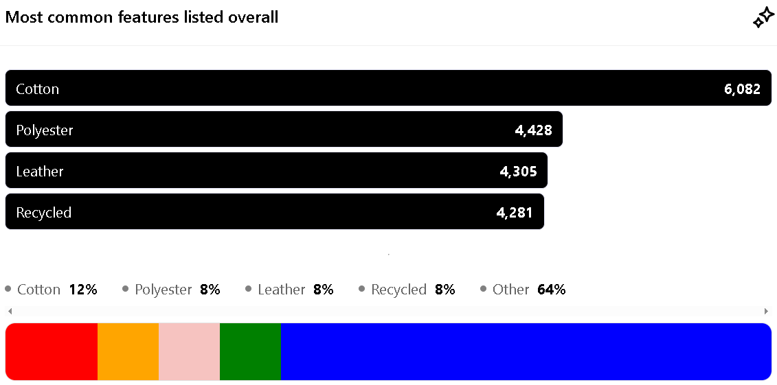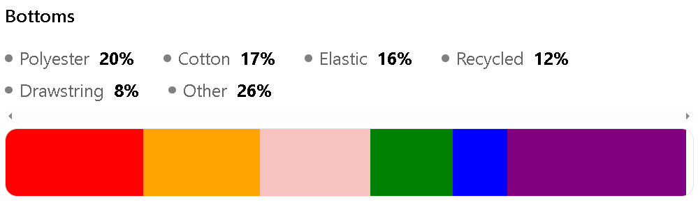 They are Polyester (20%), Cotton (17%), Elastic (16%), Recycled (12%), and Drawstring (8%).