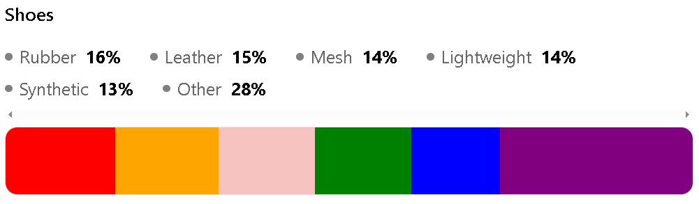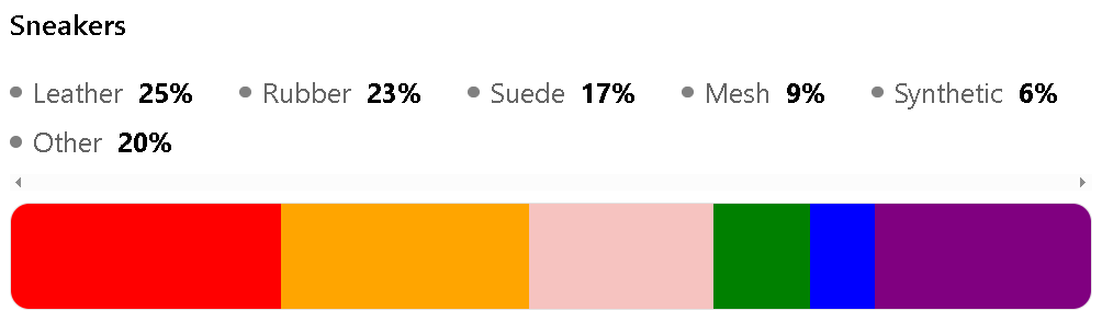 They are Leather (25%), Rubber (23%), Suede (17%), Mesh (9%) and Synthetic (16%).