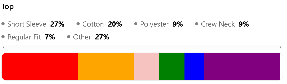 The top features for Top Category are Short Sleeve (27%), Cotton (20%), Polyester (9%), and Crew Neck (9%).
