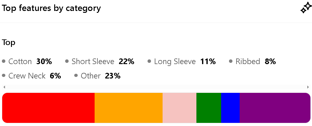 The top features within this category are Cotton (30%), Short Sleeve (22%), Long Sleeve (11%), Ribbed (8%), Crew Neck (6%).