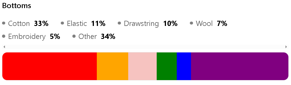 The top features within this category are Cotton (33%), Elastic (11%), Drawstring (10%), Wool (7%).
