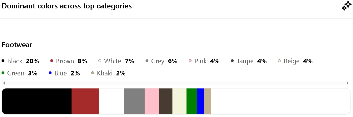 The most popular colors for Footwear are Black (20%), Brown (8%), White (7%), Grey (6%), Pink (4%).