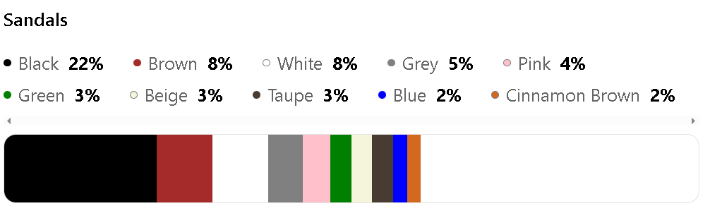 The most popular colors for Sandals are Black (22%), Brown (8%), White (8%), Grey (5%), Pink (4%).