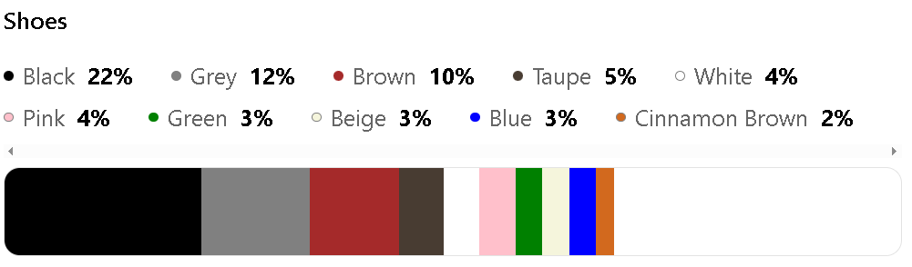 The most popular colors for Shoes are Black (22%), Grey (12%), Brown (10%), Taupe (5%), White (4%).