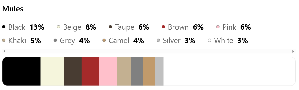 The most popular colors for Mules are Black (13%), Beige (8%), Taupe (6%), Brown (6%), Pink (6%).