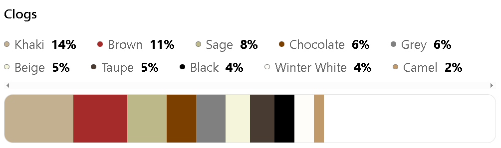 The most popular colors for Clogs are Khaki (14%), Brown (11%), Sage (8%), Chocolate (6%), Grey (6%).