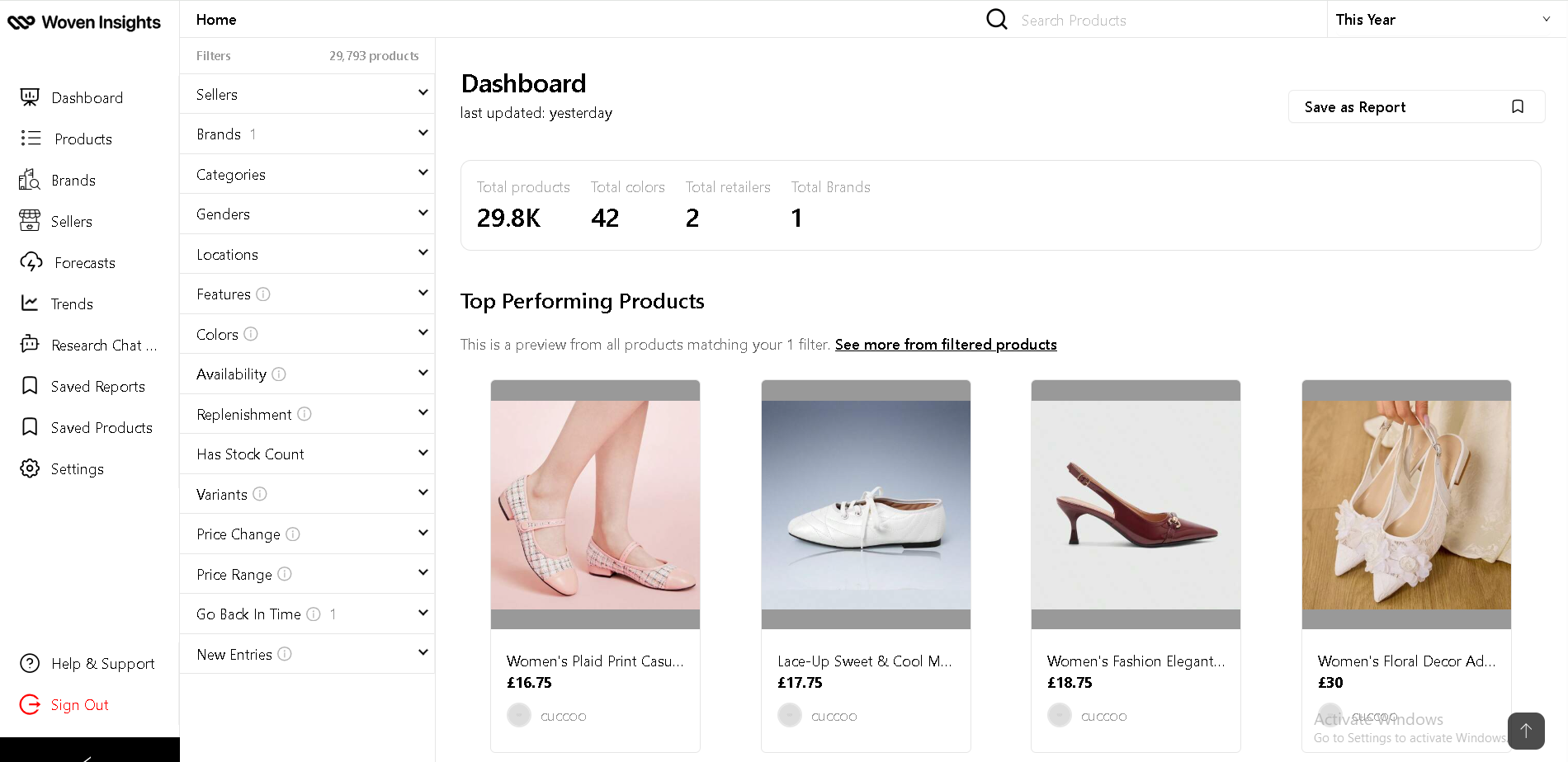 Woveninsights is a comprehensive market analytics solution that provides fashion brands with real-time access to retail market and consumer insights, sourced from over 70 million real shoppers and 20 million analyzed fashion products. Our platform helps brands track market trends, assess competitor performance, and refine product strategies with precision.