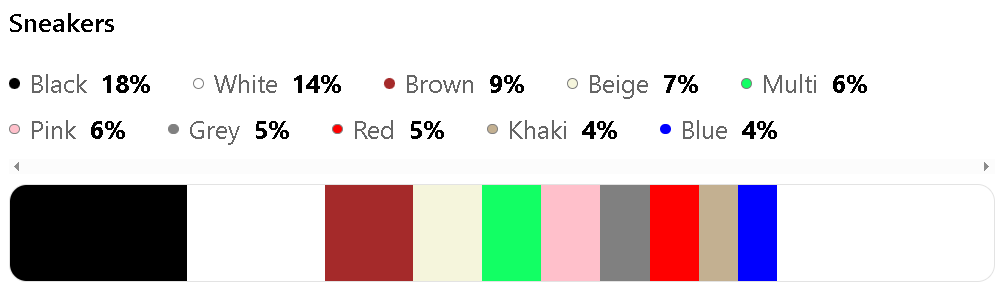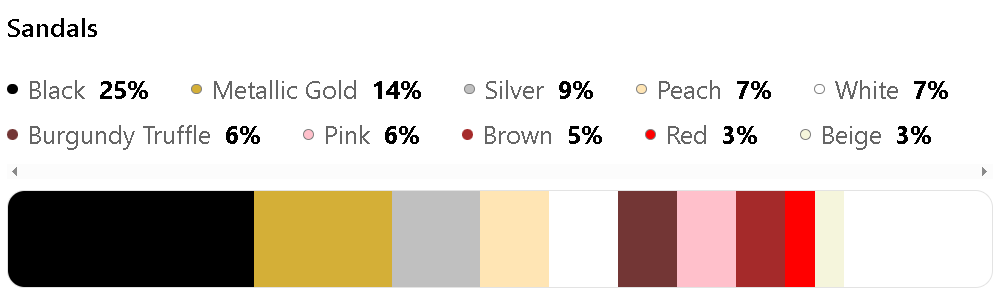 The most popular colors for Shoes are Black (35%), Burgundy Truffle (10%), Peach (8%), Brown (8%) and White (7%).