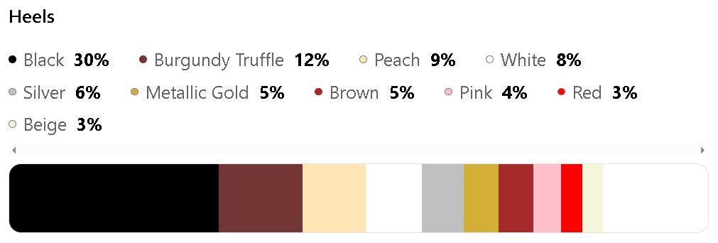 The most popular colors for Heels are Black (30%), Burgundy Truffle (12%), Peach (9%), White (8%) and Silver (6%).