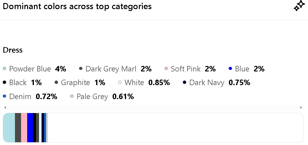 The most popular colors for Dress are Powered Blue (4%), Dark Grey Marl (2%), Soft Pink (2%), Blue (2%), and Black (1%).