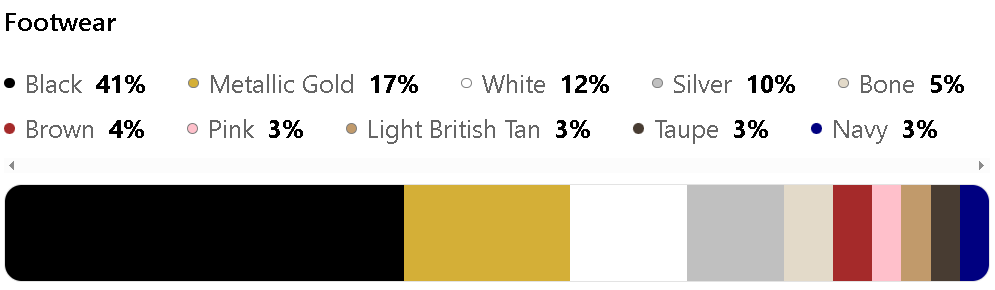 The most popular colors for Footwear are Black (41%), Metallic Gold (17%), White (12%), Silver (10%), and Bone (5%).