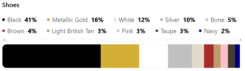 The most popular colors for Shoes are Black (41%), Metallic Gold (16%), White (12%), Silver (10%), and Bone (5%).