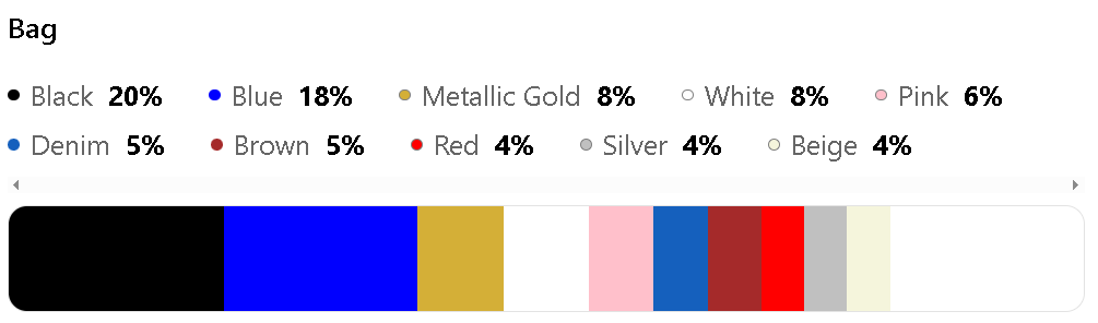 The most popular colors for Bag are Black (20%), Blue (18%), Metallic Gold (8%), White (8%) and Pink (6%).