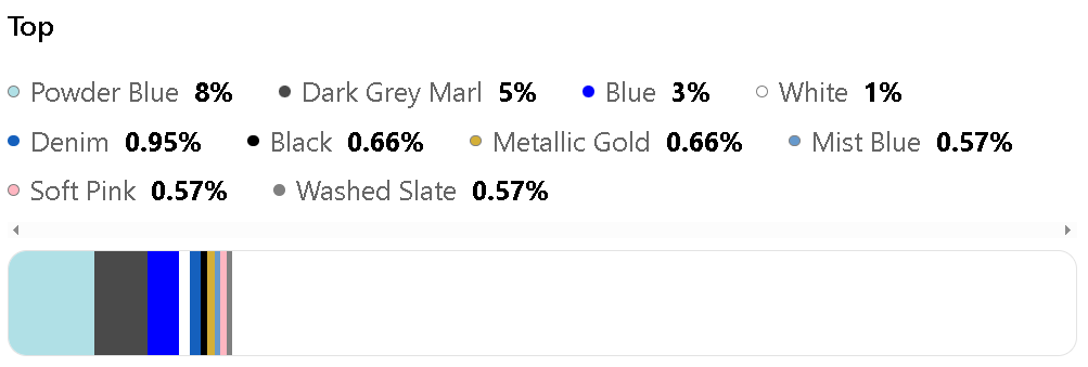 The most popular colors for Top are Powder Blue (8%), Dark Grey Marl (5%), Blue (3%), White (1%), and Denim (0.95%).