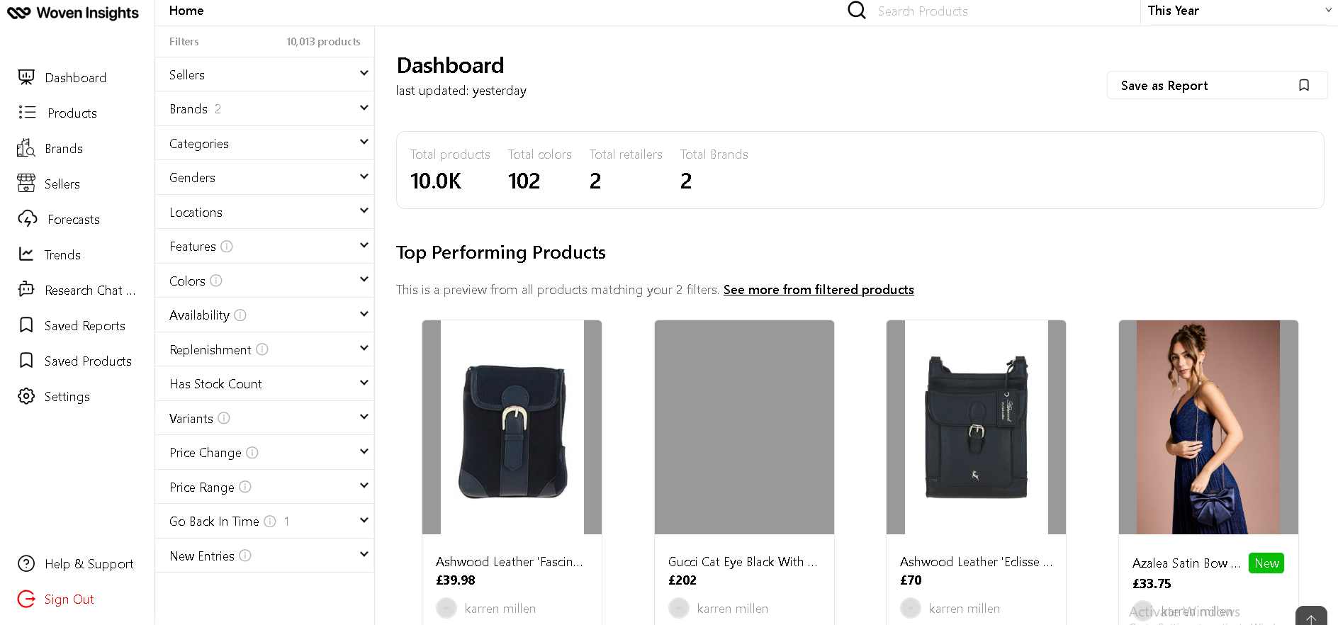 Woveninsights is a comprehensive market analytics solution that provides fashion brands with real-time access to retail market and consumer insights, sourced from over 70 million real shoppers and 20 million analyzed fashion products. Our platform helps brands track market trends, assess competitor performance, and refine product strategies with precision.