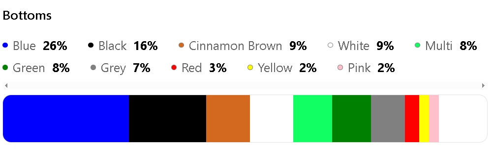 The most popular colors for Bottoms are Blue (26%), Black (16%), Cinnamon Brown (9%), White (9%), and Multi (8%).