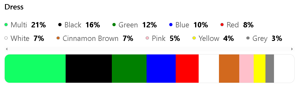 The most popular colors for Dress are Multi (21%), Black (16%), Green (12%), Blue (10%), and Red (8%).