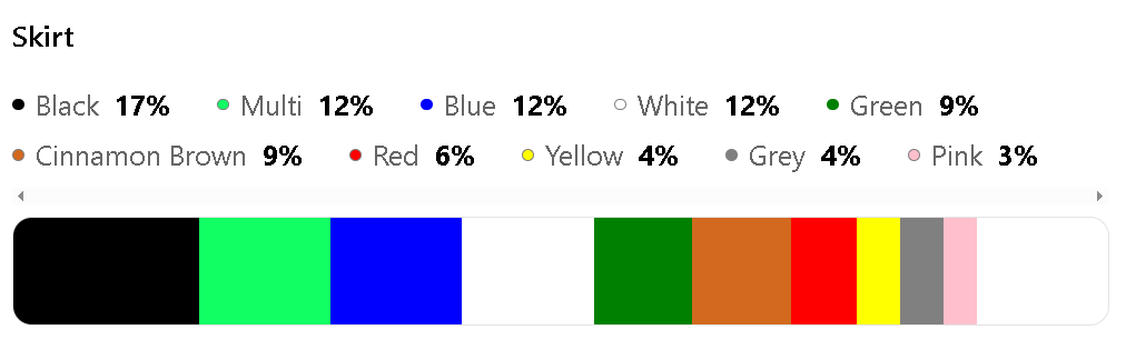 The most popular colors for Skirt are Black (17%), Multi (12%), Blue (12%), White (12%), and Green (9%).