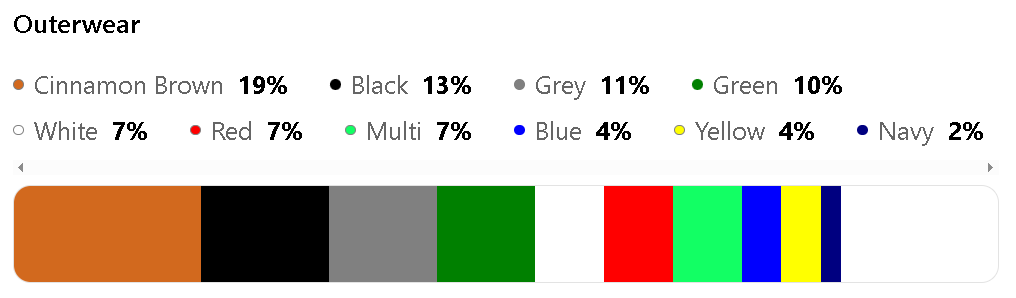 The most popular colors for Outerwear are Cinnamon Brown (19%), Black (13%), Grey(11%), Green (10%), and White (7%).