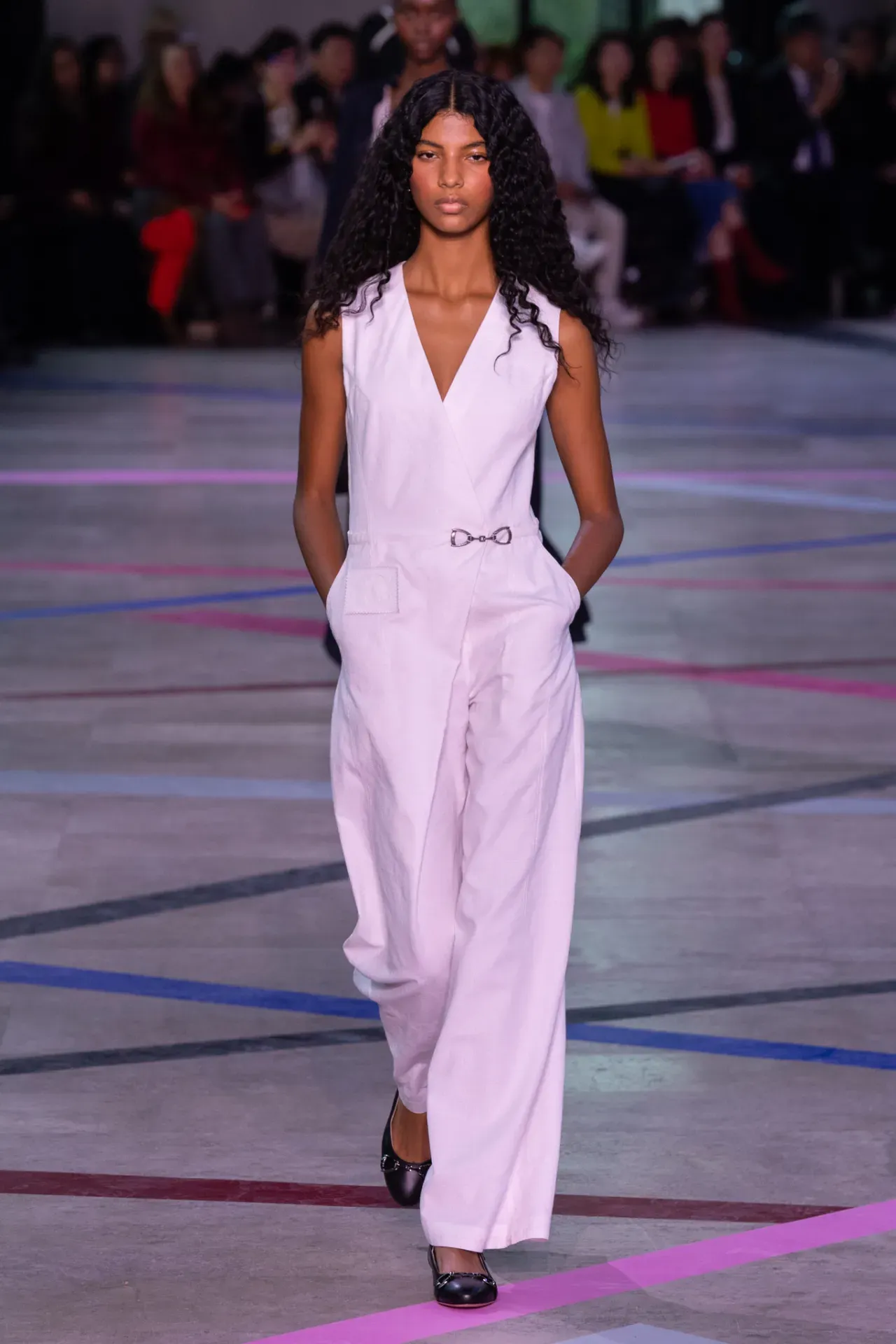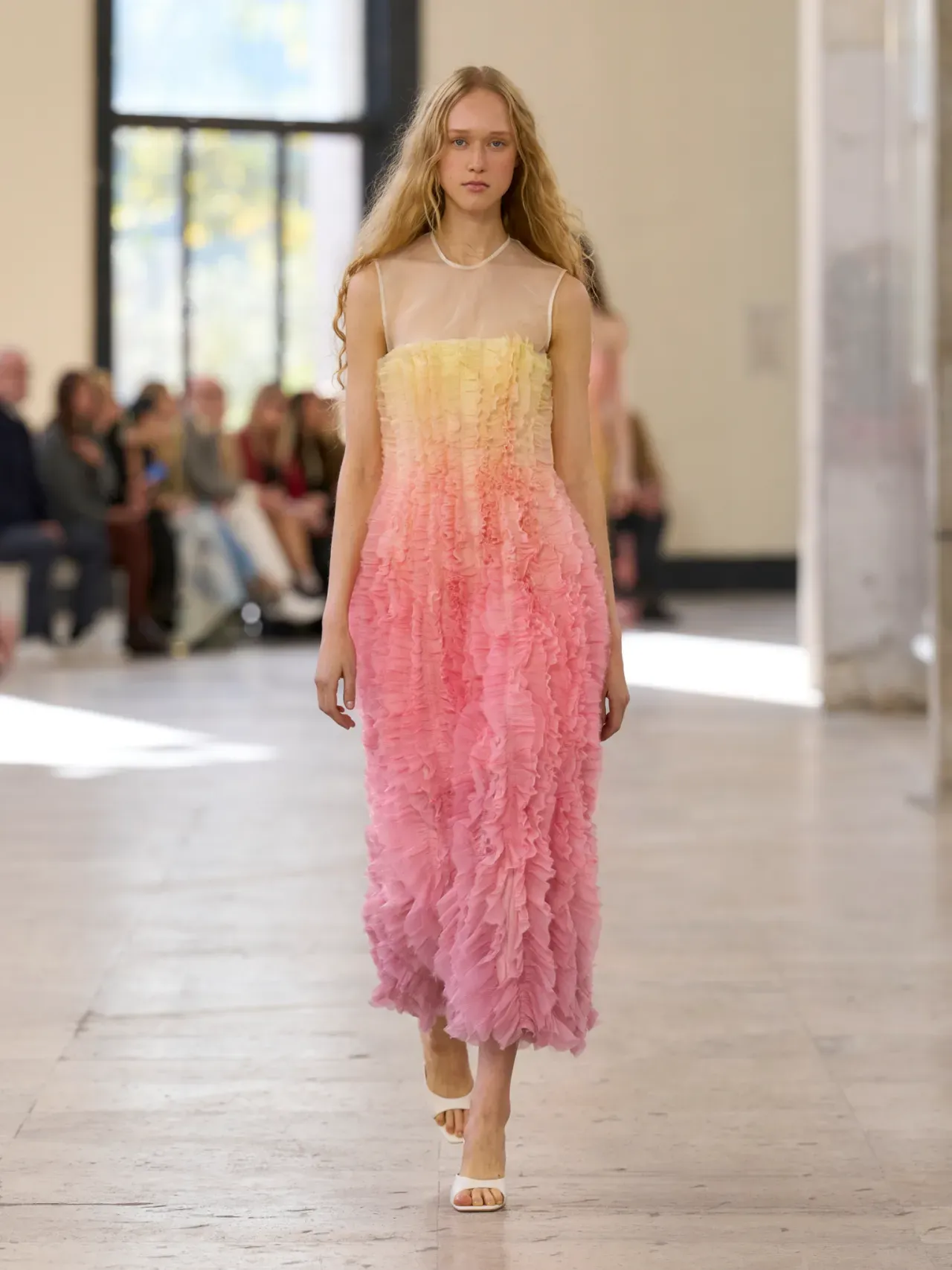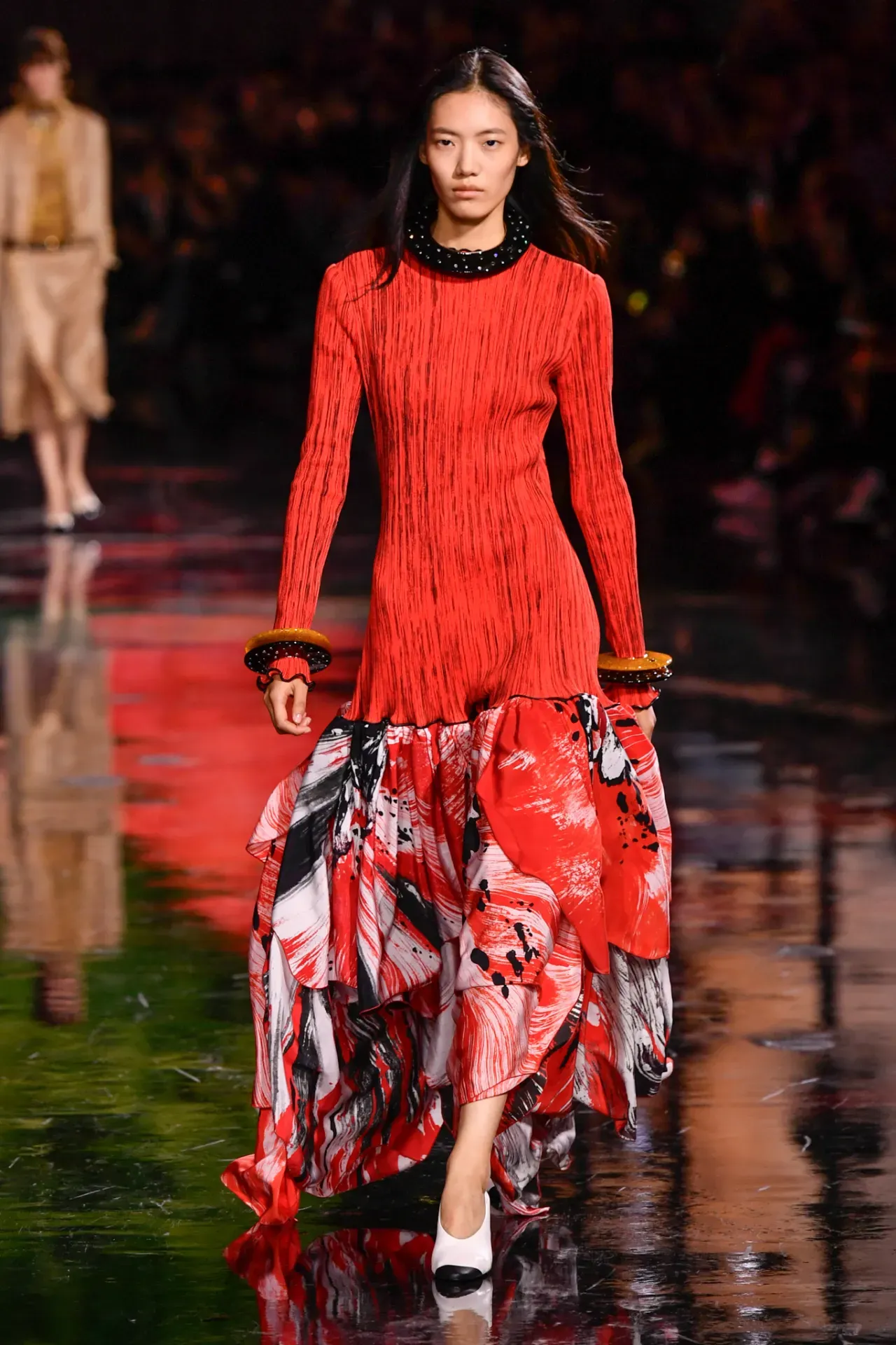 Color stories this season moved between strong anchors and vibrant accents. Black and white remained foundational across many collections, offering a neutral base for brighter shades to stand out. At CFCL, black dominated sleek looks, while Shiatzy Chen leaned into crisp whites. Elie Saab introduced warmer notes of beige and brown that gave his collection a softer, more grounded feel.